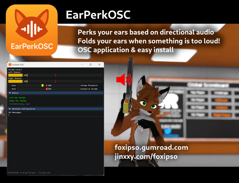Make your avatar's ears react to sounds in VRChat! Your ears will perk left, right, or both based on the direction and volume of any audio you hear on your computer, including directional audio from within VRChat. They'll also fold back protectively if you hear overwhelmingly loud sounds! The thresholds are computed automatically or you can set them manually in the desktop application. Works in VR and desktop mode.